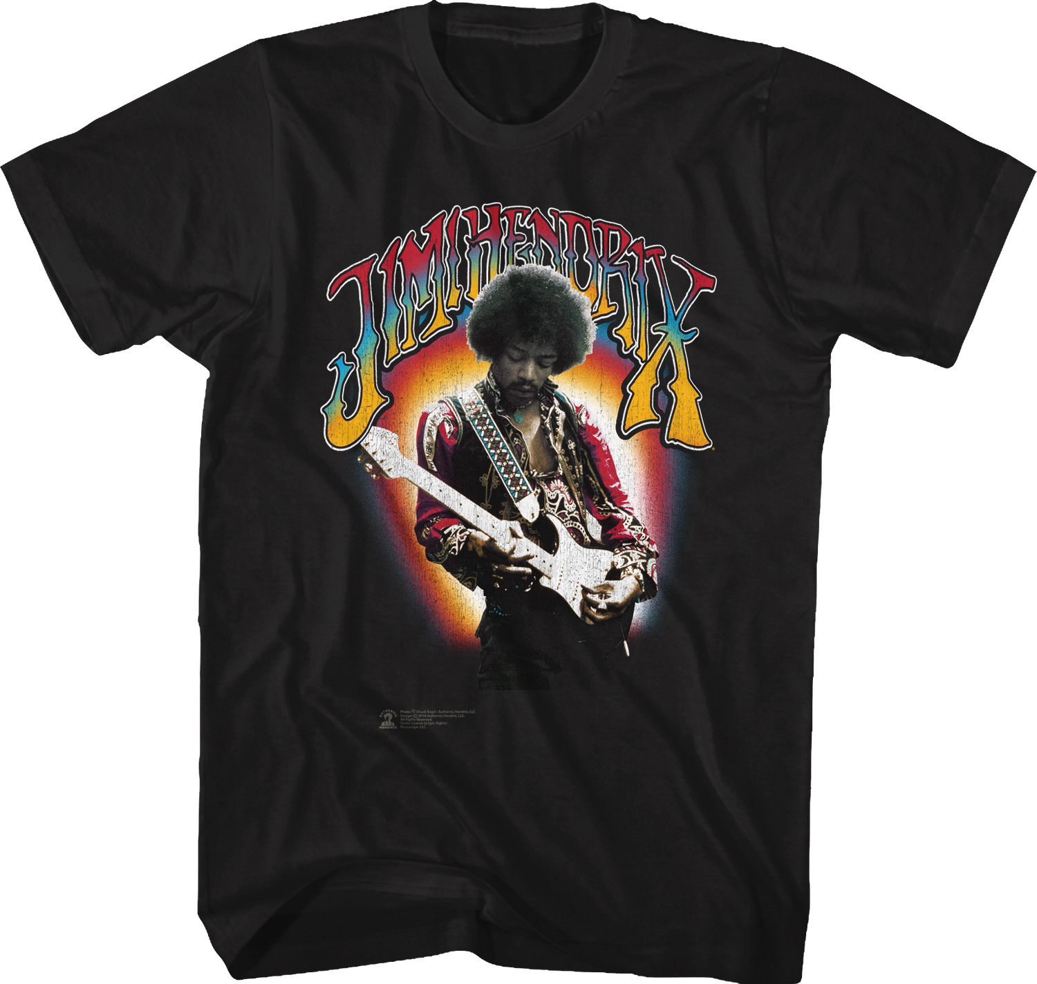 This t-shirt features an image of music legend Jimi Hendrix playing his guitar.