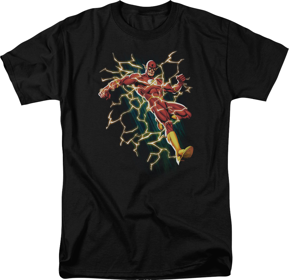 This Flash t-shirt shows the iconic superhero surrounded by lightning bolts.