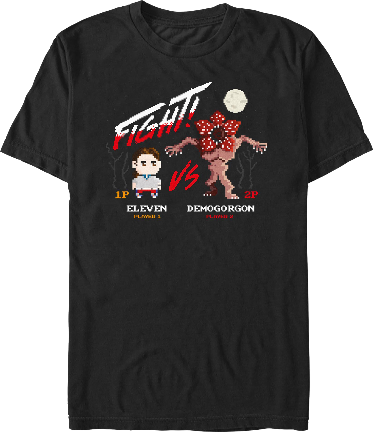 This Stranger Things t-shirt shows Eleven and the Demogorgon on an 8-bit video game's Start Screen that reads "Fight!"