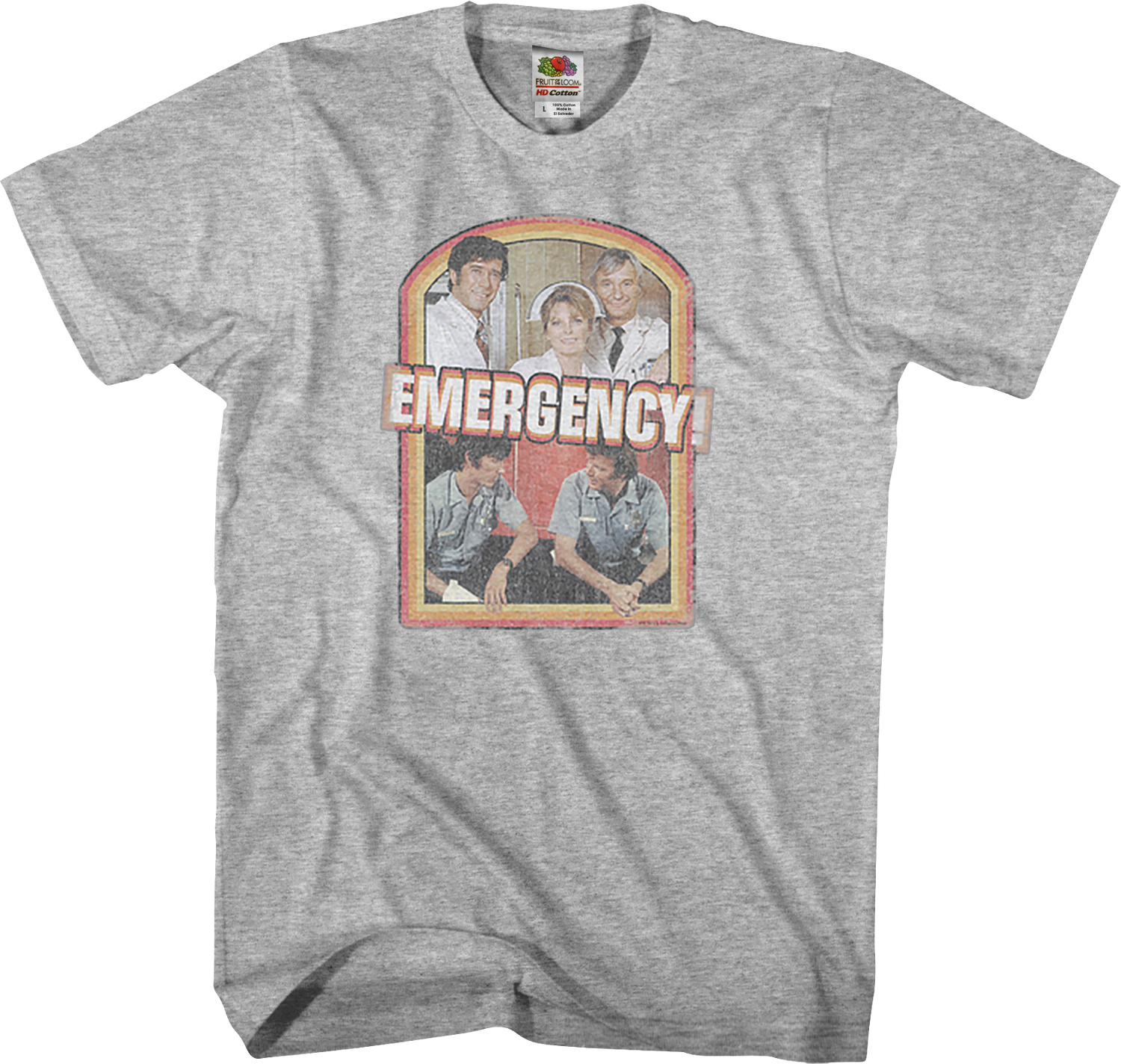 This shirt shows retro colors and is distressed, made to look like you've been wearing it since Emergency first debuted in the 70s.