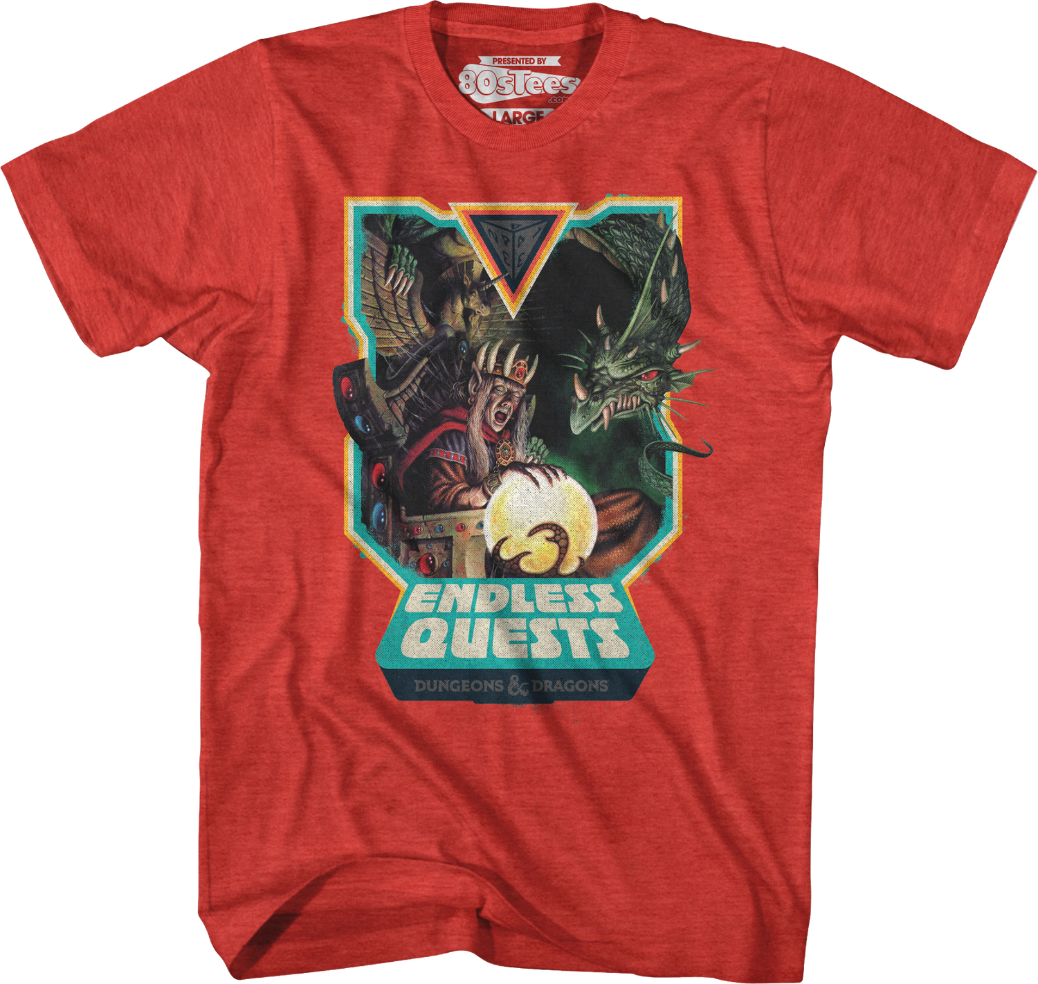 The Endless Quest books were a series of gamebooks that involved simple choices in the style of Choose Your Own Adventure books. This 80sTees.com exclusive Dungeons & Dragons t-shirt features the cover artwork for the book Dungeon of Dread. In this book, the reader is a Caric. An annoying halfling thief leads the reader to a dungeon where they battle various nasties in an attempt to get rich quick. For any seasoned fantasy gamer, this 80sTees.com exclusive Endless Quests Dungeons & Dragons T-Shirt is a must have!