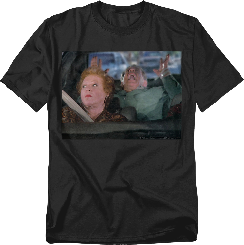 This Seinfeld t-shirt shows Estelle Costanza in the front seat of her son George's car, while her husband Frank screams "Serenity now!" in the back seat.