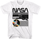 This NASA t-shirt shows a silhouette of the planet Saturn. The shirt includes an image of space shuttle flying over a rainbow. The shirt reads "We develop and fund space technologies that will enable future exploration and benefit life on Earth."