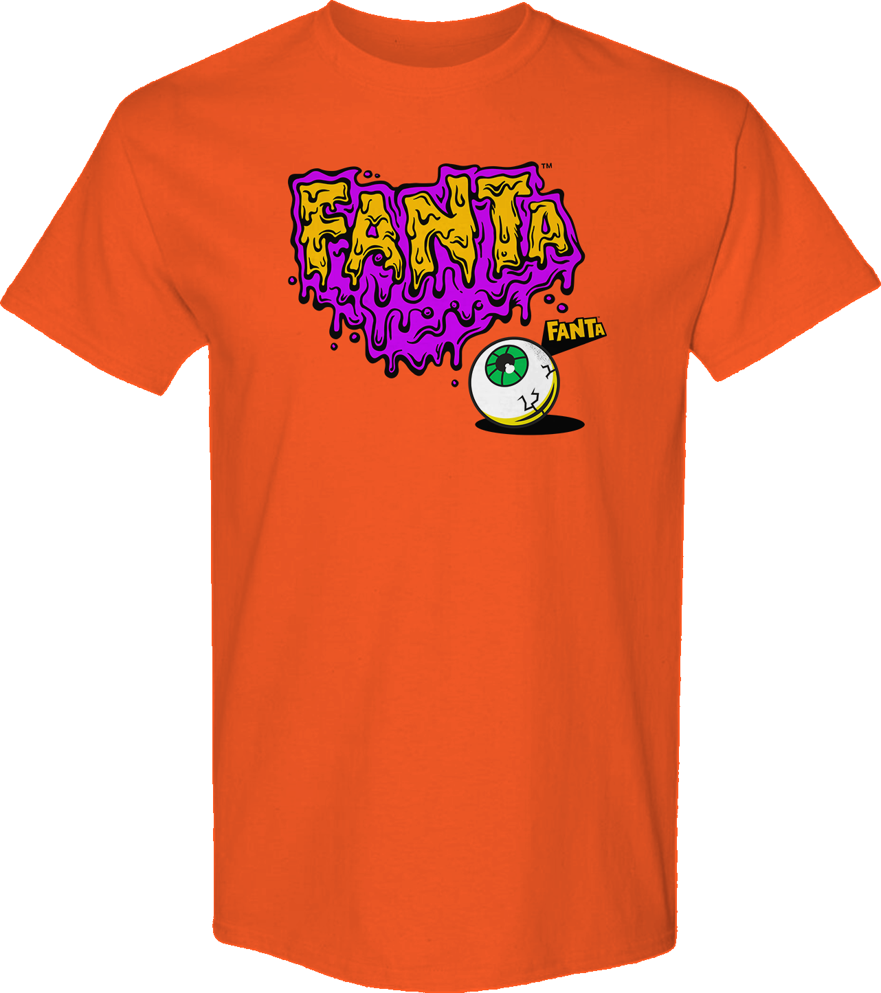 This Fanta t-shirt shows an eyeball looking at a Fanta logo that is dripping with purple slime.