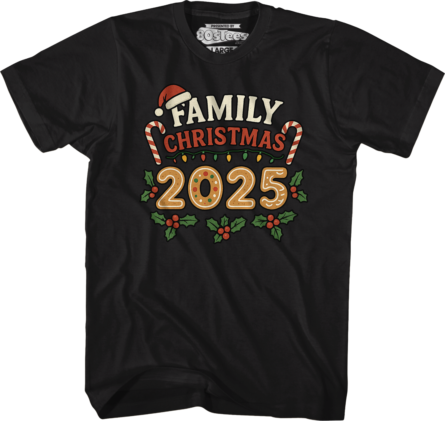 This 80sTees.com exclusive t-shirt features candy canes, Christmas lights, and mistletoe. The shirt reads "Family Christmas" and the year "2025" made out of Christmas cookies.