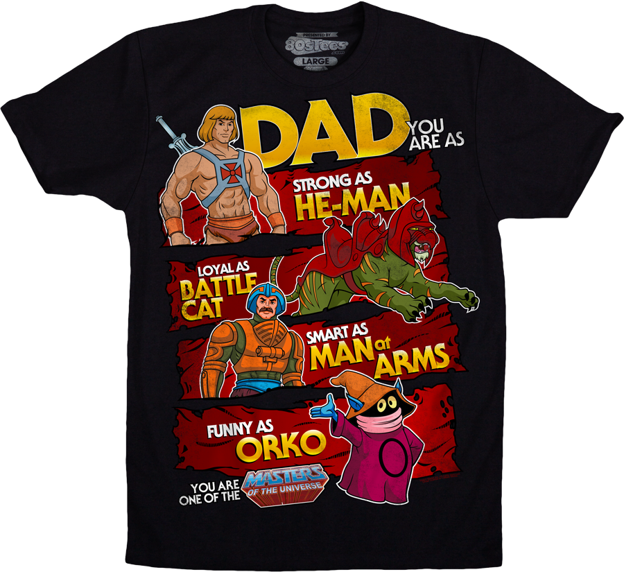 The shirt features images of He-Man, Battle Cat, Man-At-Arms and Orko. The shirt reads Dad You Are As Strong As He-Man, Loyal As Battle Cat, Smart As Man At Arms, Funny As Orko, You Are One Of The Masters Of The Universe. This Father's Day, this 80sTees.com exclusive Father's Day He-Man t-shirt is sure to please Masters of the Universe fans and fathers alike!