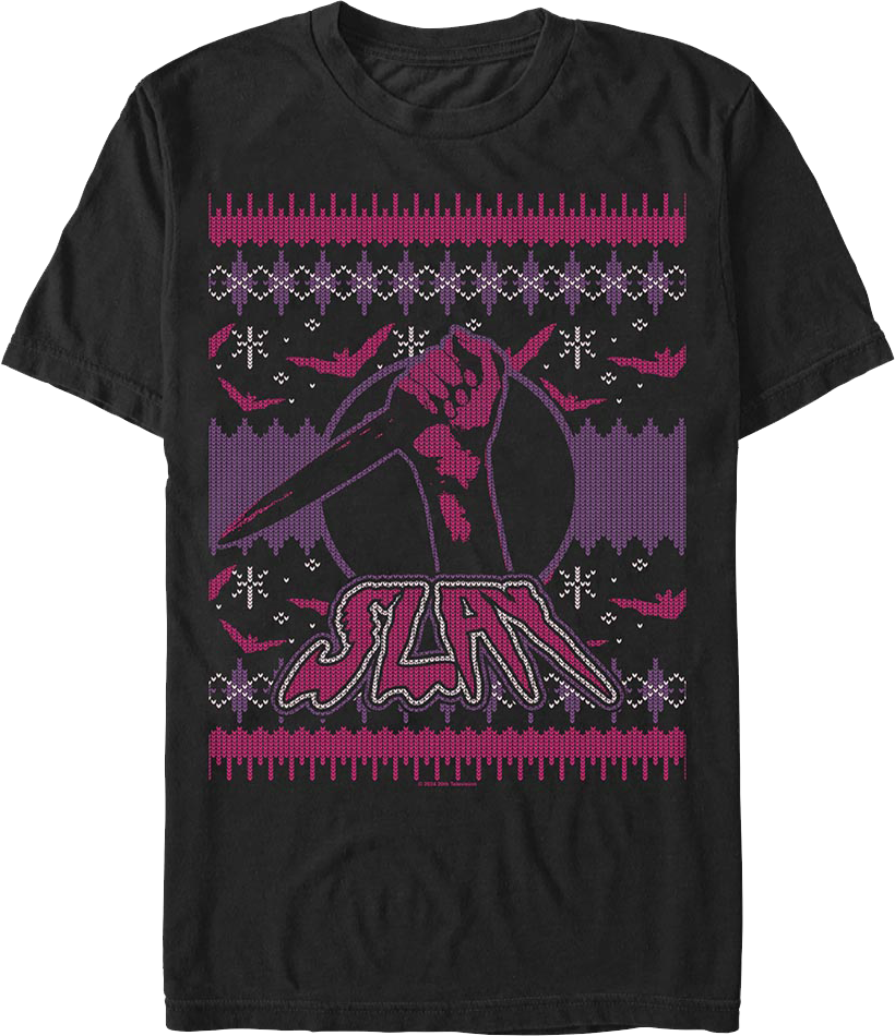 This Buffy The Vampire Slayer t-shirt is designed to look like a knitted Christmas sweater. The shirt shows snowflakes, vampire bats, and Buffy Summers' hand holding a wooden stake. The shirt reads Slay.