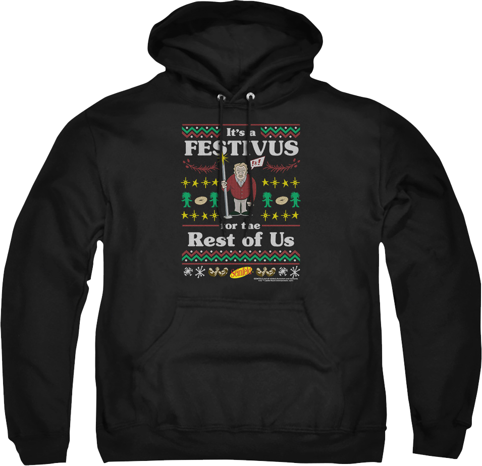 Frank Costanza gave up on Christmas because of the stress of the holiday season, and he created his own holiday named Festivus. Festivus had three great traditions: An aluminum pole was put up instead of a Christmas tree because tinsel is distracting; the Airing of Grievances allowed each family member to tell the other what they had done to be irritating that year; and Festivus can not end until Feats of Strength are performed, where Frank is pinned to the floor. Let everyone know you are a fan of the hilarious holiday when you wear this Faux Ugly Festivus Sweater Seinfeld Hoodie!