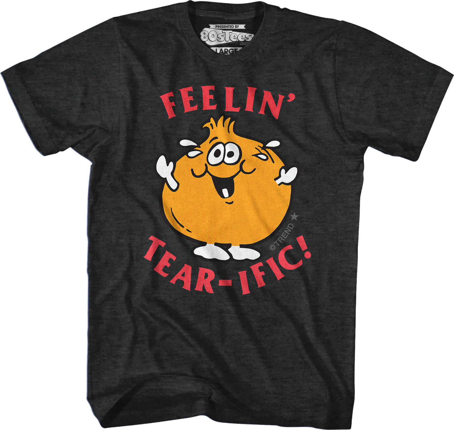 This 80sTees.com exclusive TREND Scratch 'n Sniff Stinky Stickers® t-shirt features the crying onion from the TREND Tear-ific Scratch ‘n Sniff Stinky Stickers® design. The shirt reads FEELIN' TEAR-IFIC!