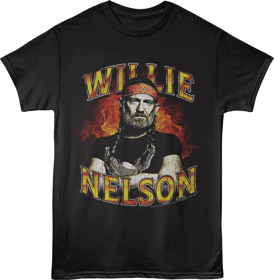 Willie Nelson plays by his own set of rules. He uses emotional heartbreak, longing, and freedom to write honest songs that cut straight to the heart. Willie Nelson's hits include "On The Road Again", "Across The Borderline", "Mammas Don’t Let Your Babies Grow Up To Be Cowboys" and "Crazy". Everyone will instantly know you are a fan when you wear this Flames Willie Nelson T-Shirt!