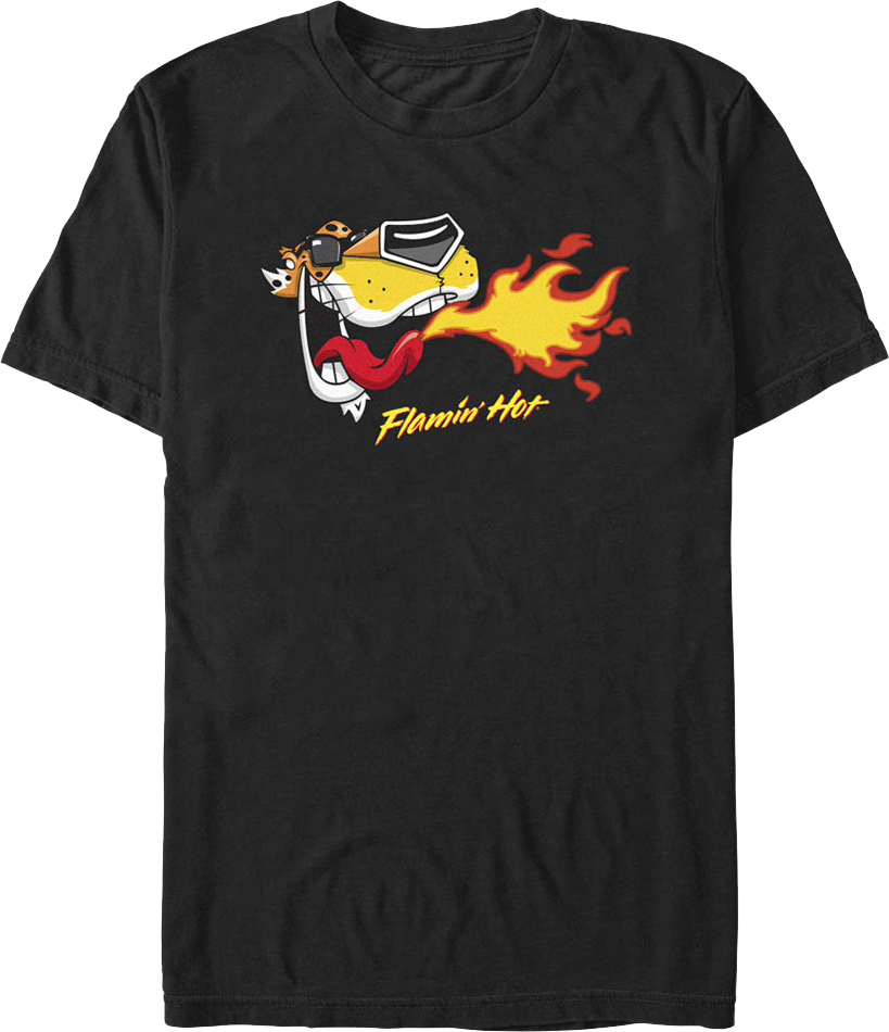 This Cheetos t-shirt shows Chester Cheetah breathing fire after eating Flamin' Hot Cheetos.
