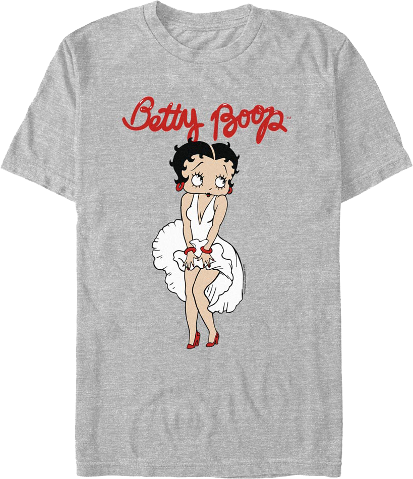 This Betty Boop t-shirt shows the animated icon recreating Marilyn Monroe's famous "flying skirt" scene from the 1955 movie The Seven Year Itch.