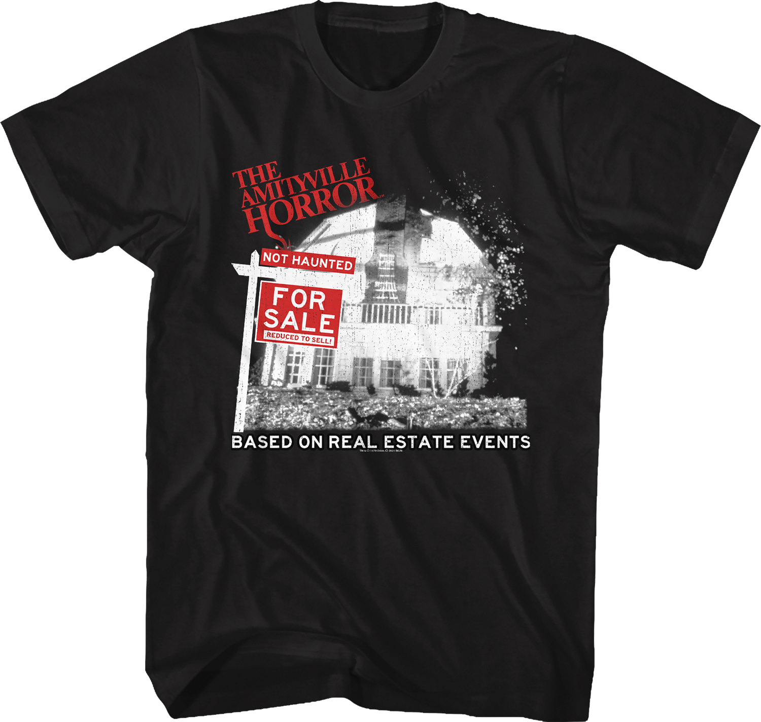 This Amityville Horror t-shirt shows a For Sale sign in front of the horrifying house that was shown in the 1979 classic. The sign promises that the house is not haunted.