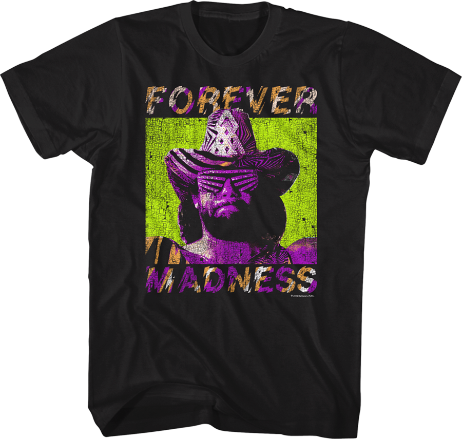 "Macho Man" Randy Savage is instantly recognizable with his trademark ring entrance attire, including his cowboy hat and sunglasses. Show that you are a forever fan of the wrestling icon when you wear this Forever Madness Macho Man Randy Savage T-Shirt!