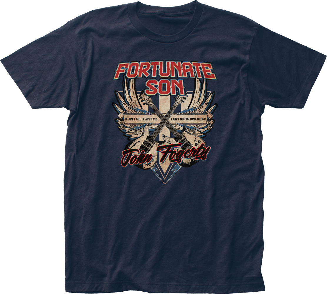 This Fortunate Son John Fogerty T-Shirt features crossed guitars with wings in the background. The songwriter's name is shown along with the song title "Fortunate Son" and the lyrics, "It ain't me. It ain't me. I ain't no fortunate one." Creedence Clearwater Revival released the song in 1969 and it became an anthem for many people regarding the Vietnam war. It has since been used in countless movies and television shows and covered by various artists.