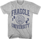 This Fraggle Rock t-shirt shows Boober, Gobo, Red, Wembley, and Mokey in a collegiate logo for Fraggle Rock University.