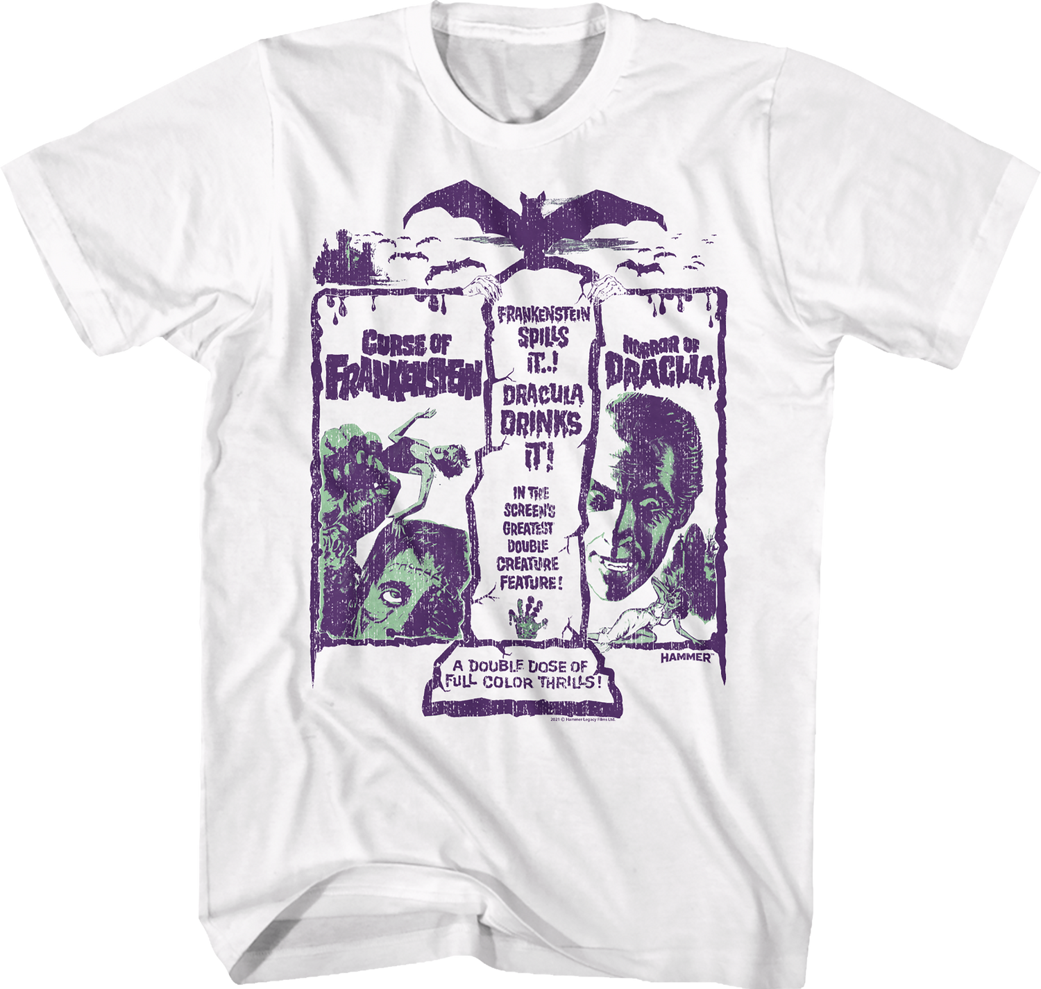 Let everyone know that you are a fan of the most iconic cinematic monsters of all time with this Frankenstein And Dracula Double Feature Hammer Films T-Shirt!