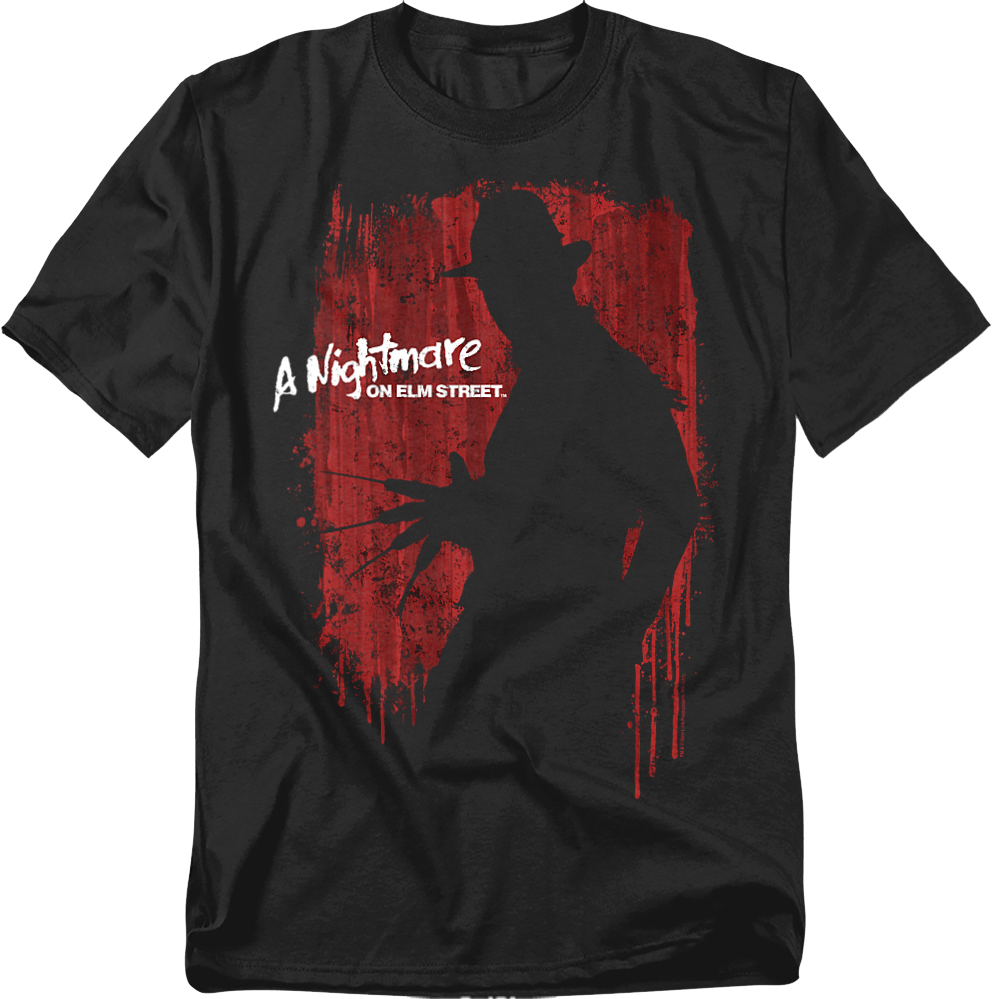 This Nightmare On Elm Street t-shirt shows Freddy Krueger's silhouette against splattered blood. The silhouette includes Freddy's iconic fedora and bladed glove.