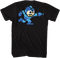 The front of this Mega Man t-shirt features the logo for the classic video game. The back of the shirt shows an 8-bit image of the "Blue Bomber."