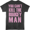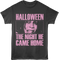 The front of this Halloween t-shirt features an image of Laurie Strode, and includes the movie tagline "The Night He Came Home." The back of the shirt features the quote "You Can't Kill The Boogeyman."