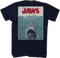 The front of this Jaws t-shirt features the movie's logo. The back of the shirt shows the movie poster shows a great white shark ready to attack a swimmer.