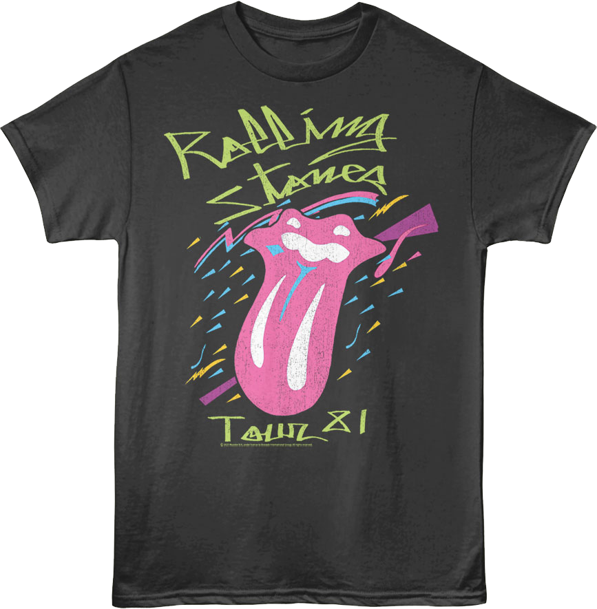 The front of this Rolling Stones t-shirt features the band's tongue logo surrounded by colorful retro shapes. This image was used to promote the band's 1981 tour. The back of the shirt reads "Stoned At The Dome" and "Seattle 1981."