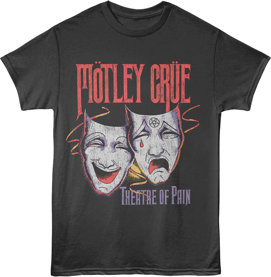 The front of this Motley Crue t-shirt features the cover artwork for the band's third studio album, Theatre of Pain. The artwork shows the ancient sock and buskin symbols of comedy and tragedy. The back of the shirt shows the album's track list.