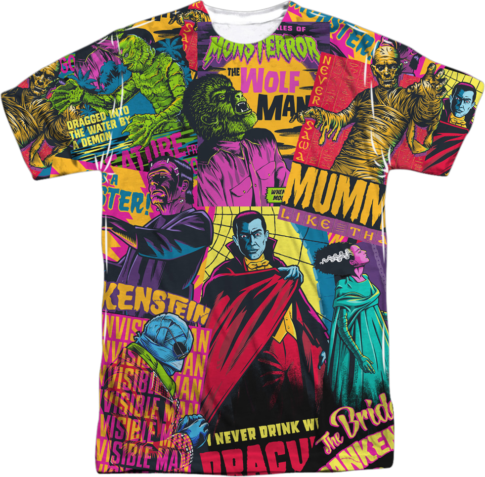 The monsters on this t-shirt will forever be known as the greatest horror characters of all time. Show that you are a fan with this Front Sublimation Universal Monster Mash T-Shirt!