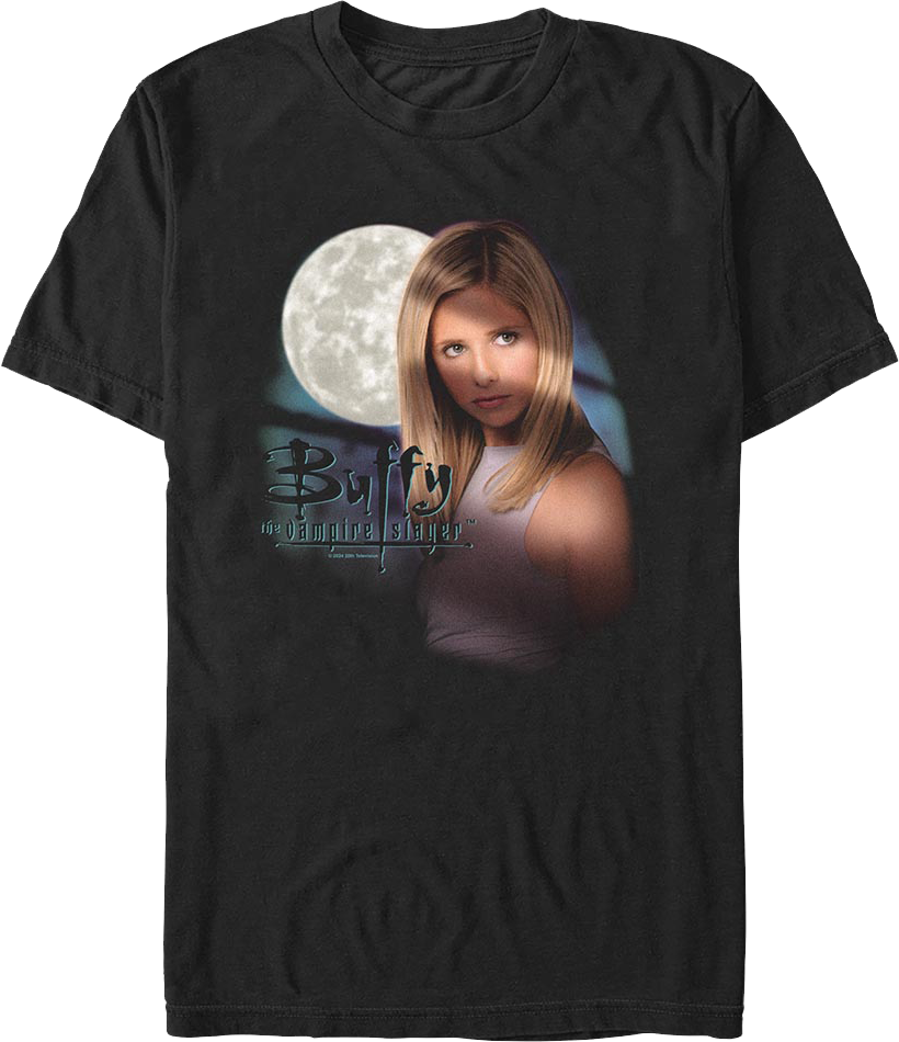 This Buffy The Vampire Slayer t-shirt shows Buffy Summers posing with a full moon. The shirt includes the Buffy The Vampire Slayer logo.
