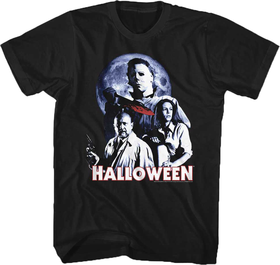 This Halloween t-shirt shows a full moon behind the cast of John Carpenter's terrifying classic movie. The shirt features Dr. Sam Loomis, Laurie Strode and Michael Myers, also known as The Shape.