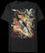 This shirt shows a Stormtrooper, Darth Vader and Boba Fett. The shirt also shows TIE Fighters, the Death Star, a meteor shower, and Bobba Fett's attack craft Slave I.