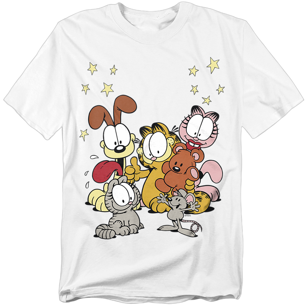 This Garfield and Friends T-Shirt shows all of your favorite characters from the comic strips, television shows, and movies. Garfield is holding Pooky and surrounded by Odie, Arlene, Nermal, and Squeak. The lovable group of animals have entertained fans since the fat cat first appeared in comics in 1978.