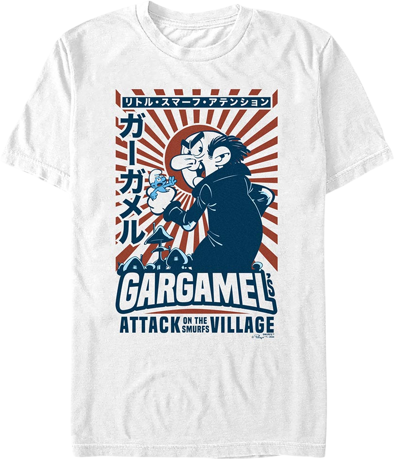 This Smurfs t-shirt shows Gargamel capturing a Smurf on a Japanese poster for the monster movie Gargamel's Attack On The Smurfs Village.