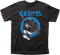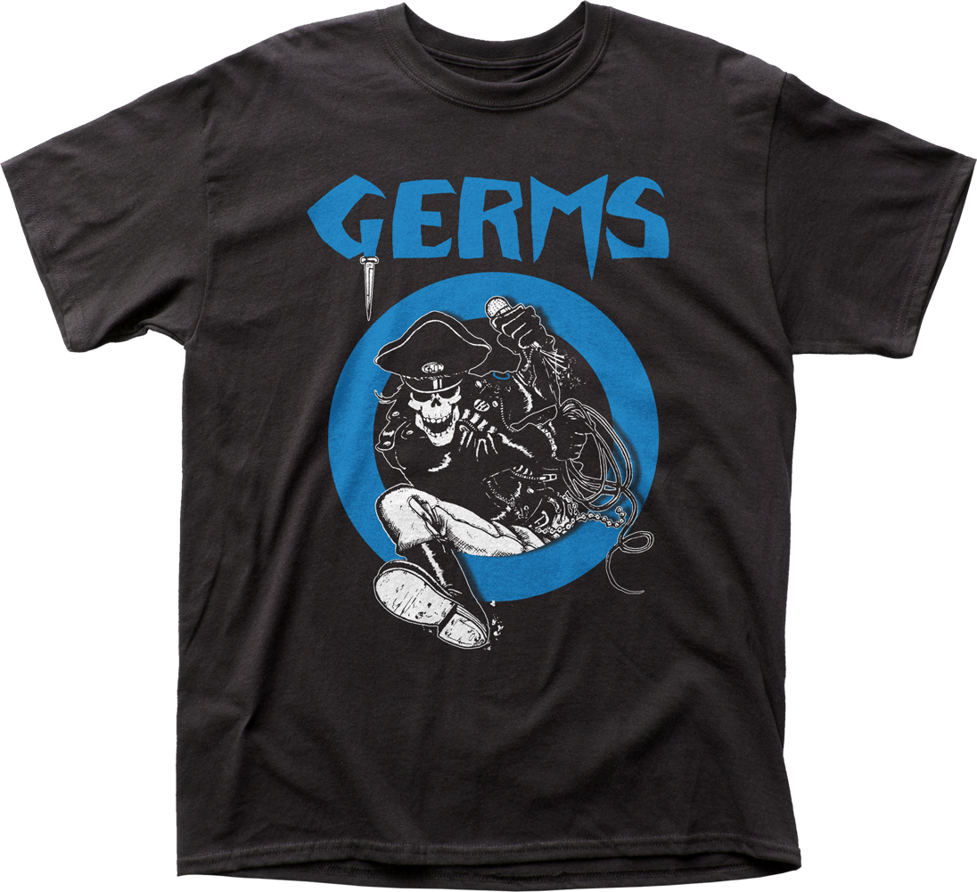 This Germs t-shirt shows a skeleton, who is holding a microphone and dressed in leather, climbing through a trademark Germs circle.