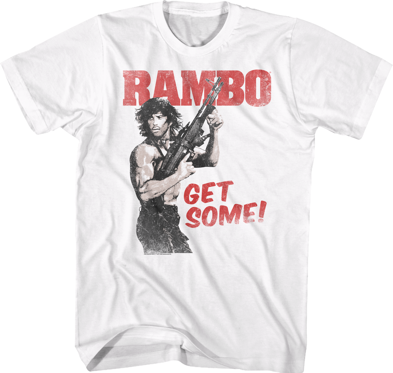 This Rambo t-shirt features an illustrated image of John Rambo holding a machine gun. The shirt reads Get Some!
