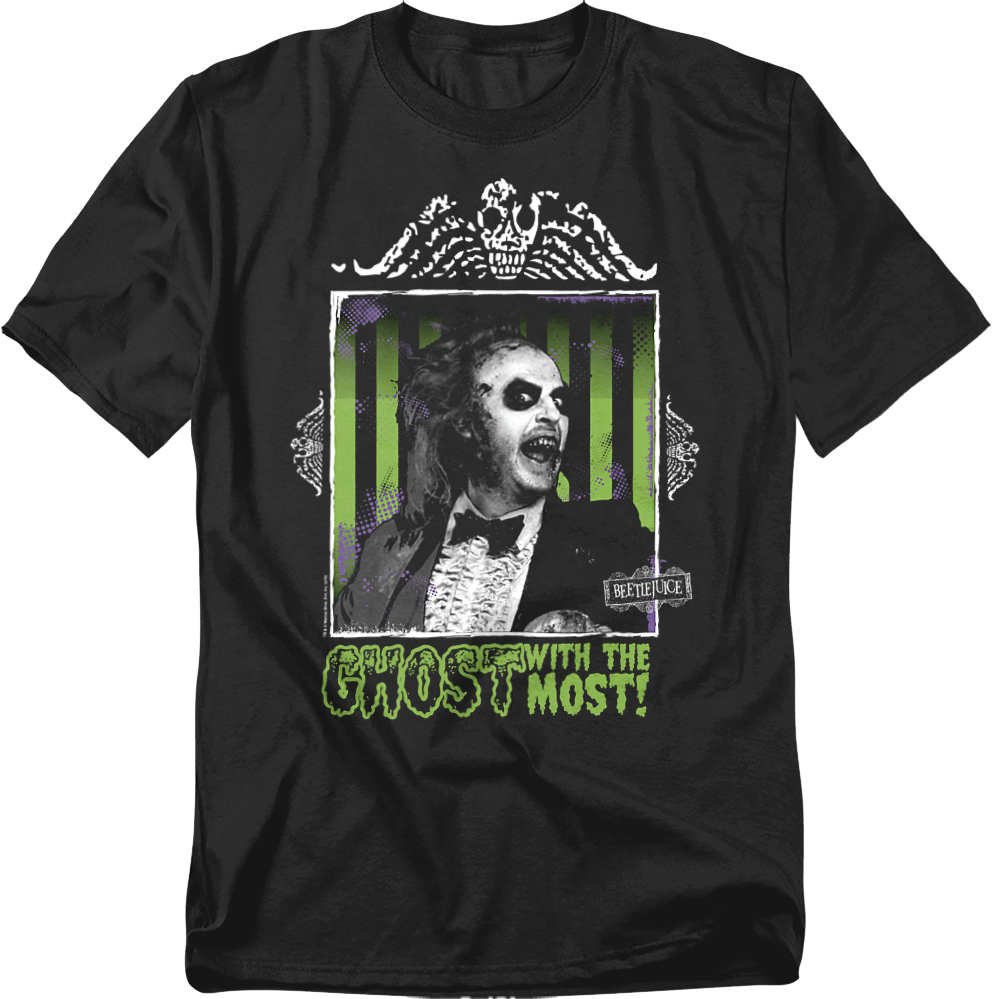 This Beetlejuice t-shirt features a framed photo of Beetlejuice in his wedding tuxedo. The shirt reads Ghost With The Most!