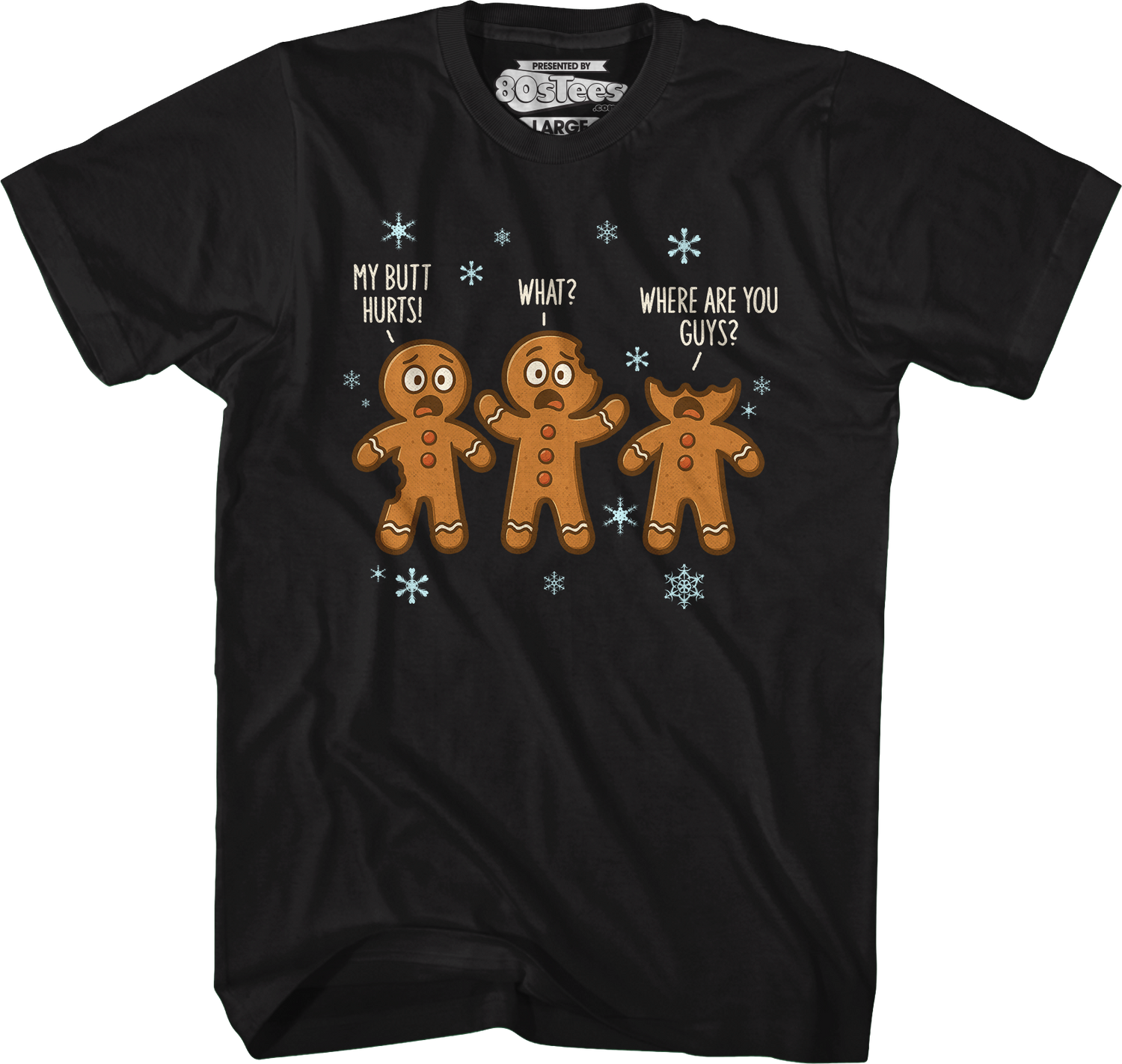 This 80sTees.com exclusive t-shirt shows three gingerbread men surrounded by snowflakes. The first gingerbread man has a bite taken out of the lower half of his body where his butt would be, and he is saying "My butt hurts!" The second gingerbread man has a bite taken out of his head where his ear would be, and he is saying "What?" The third gingerbread man has a bite taken out of his head where his eyes would be, and he is saying "Where are you guys?"