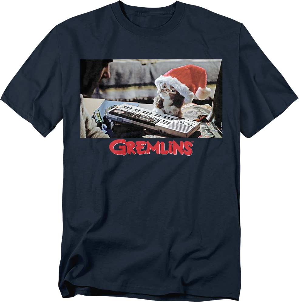 This Gremlins t-shirt shows Gizmo wearing a Santa Claus hat and playing a Casio PT-50 keyboard.
