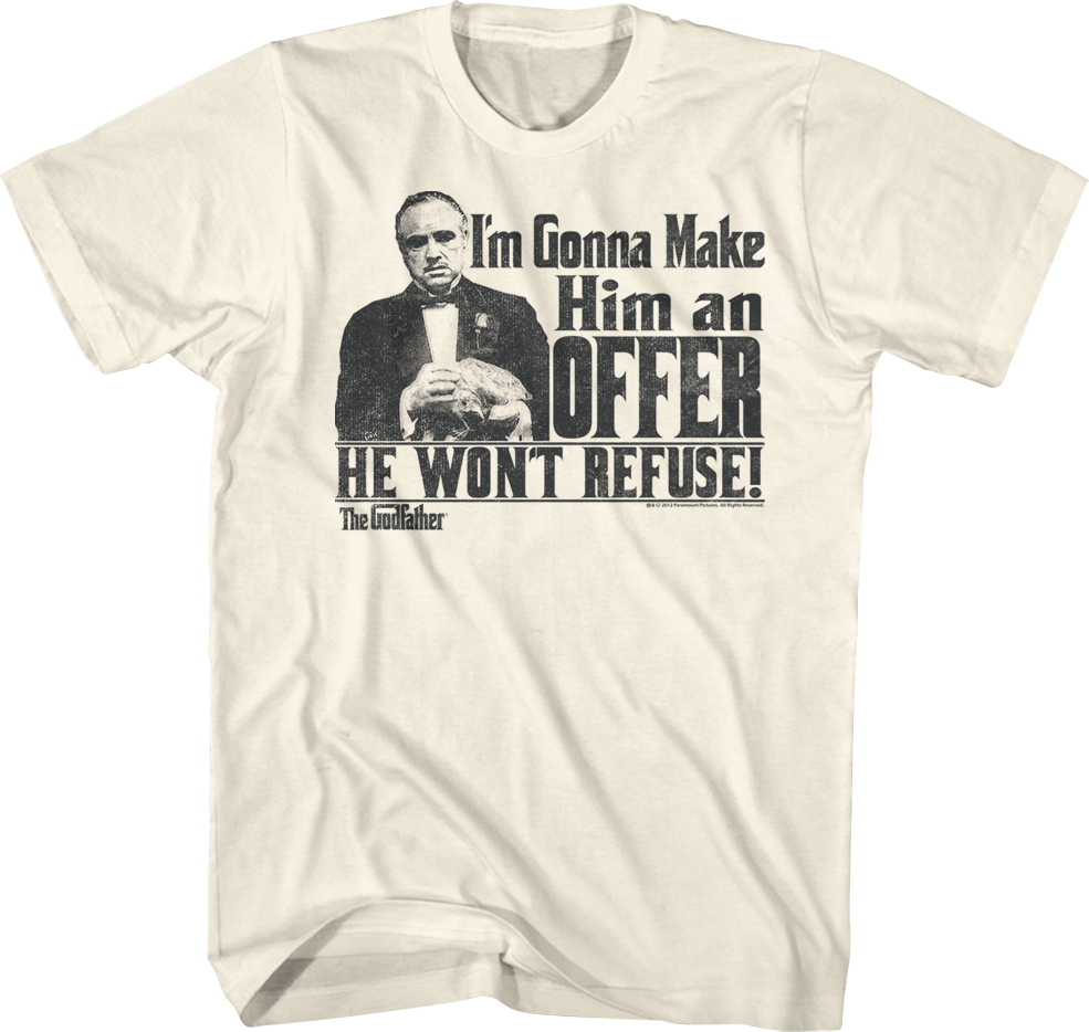The Godfather has appeared on countless lists as one of the greatest movies of all time. Now, you can show that you are a fan with this Offer He Can't Refuse T-Shirt!