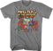 In the classic animated series Masters of the Universe, He-Man and his friends protected the secrets of Castle Grayskull from Skeletor and his henchmen. This Masters of the Universe t-shirt features the main cast from the 80s cartoon. The shirt shows He-Man, Battle Cat, Man-At-Arms, Teela, the Sorceress, and Orko on the good side. Skeletor, Beast Man, Trap Jaw, and Evil-Lyn are seen on the evil side.