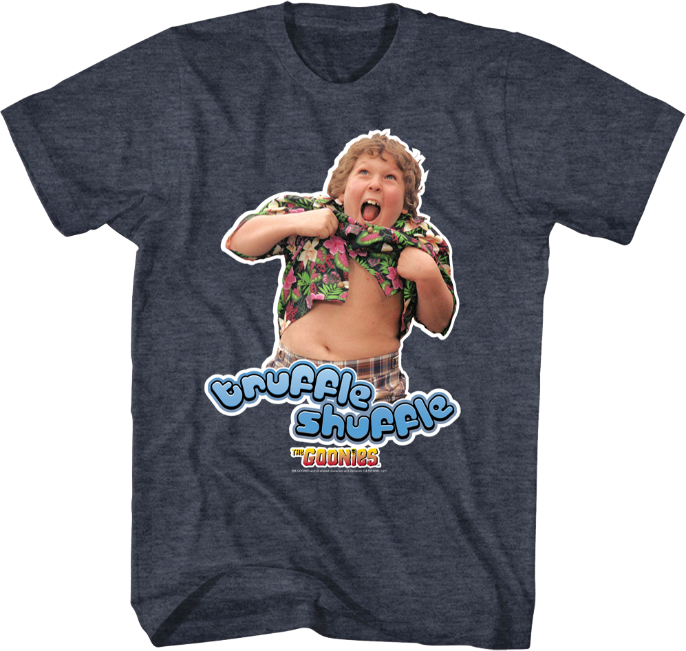 There were many "shuffle" dance crazes in the 80's- the Melbourne Shuffle, the Ickey Shuffle, the Super Bowl Shuffle. But none were as famous as the Truffle Shuffle. This Goonies shirt features Chunk doing the Truffle Shuffle in front of Mikey's house. Every day he's shufflin'.