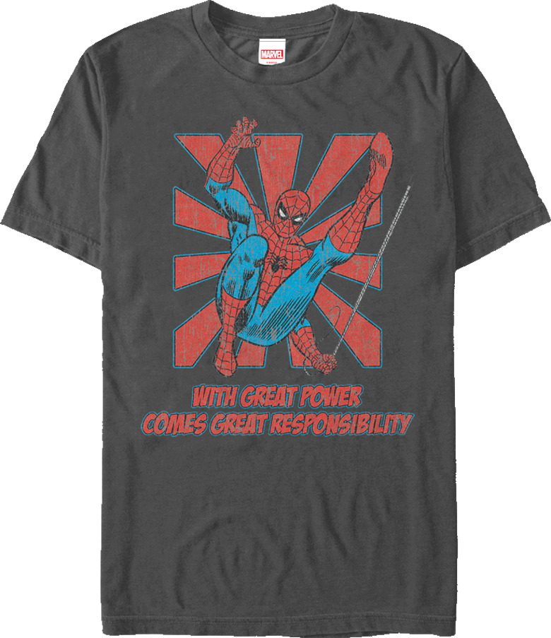 This Great Power Spider-Man T-Shirt features a distressed image of the friendly neighborhood Spider-Man swinging on his web. The t-shirt also includes one of Spidey's most popular quotes, "With Great Power Comes Great Responsibility".