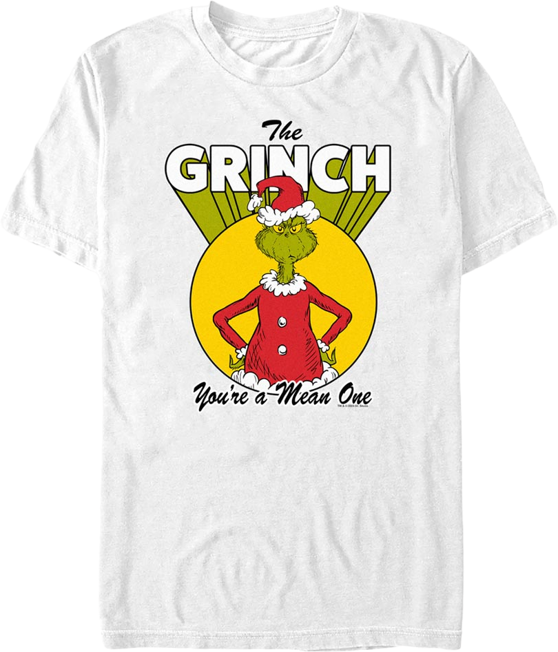 This Dr. Seuss t-shirt shows the iconic character the Grinch dressed in his Santa Claus outfit. The shirt reads "You're a Mean One."