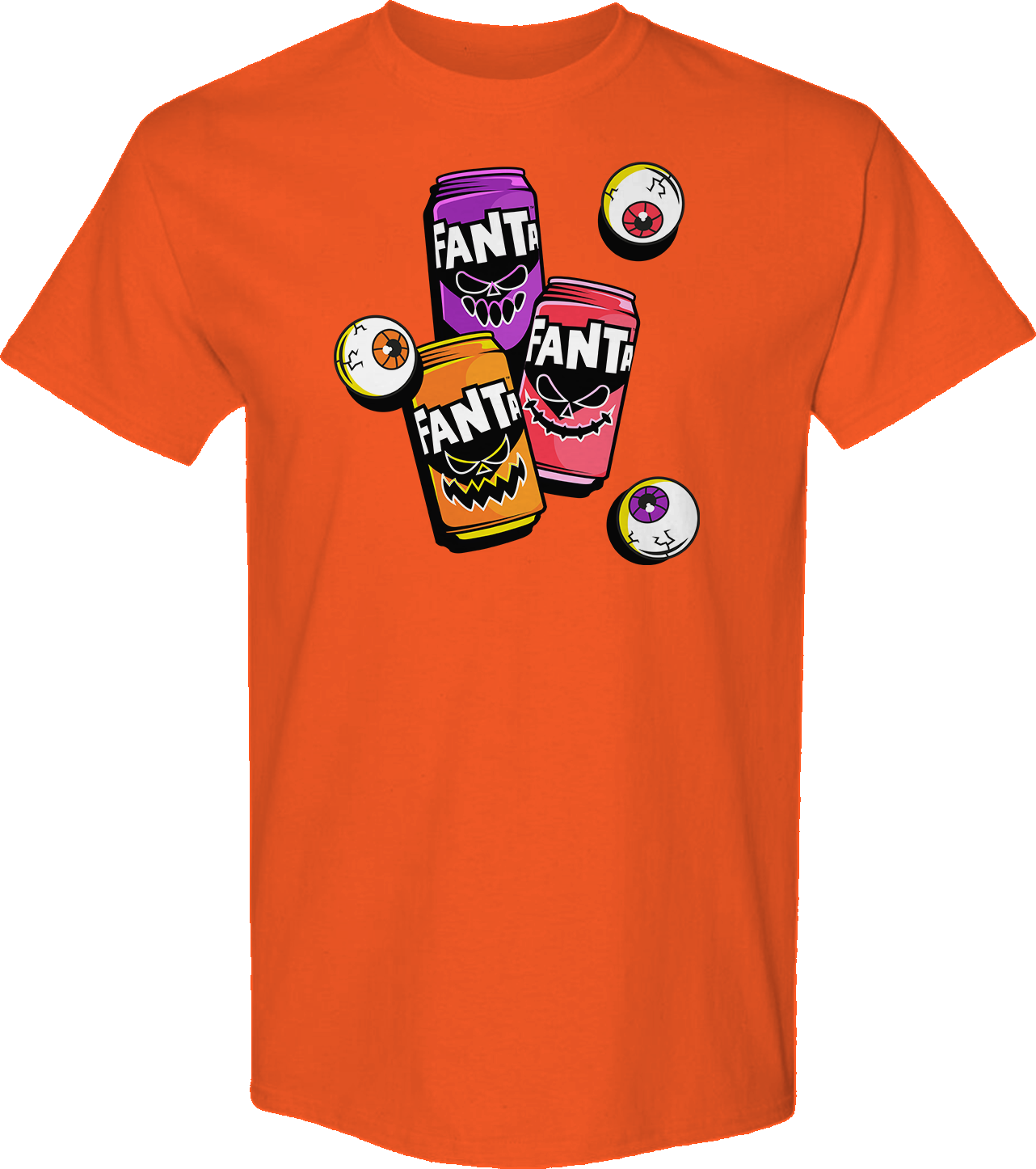 This Fanta t-shirt features eyeballs and cans with Halloween Jack-o'-Lantern designs.