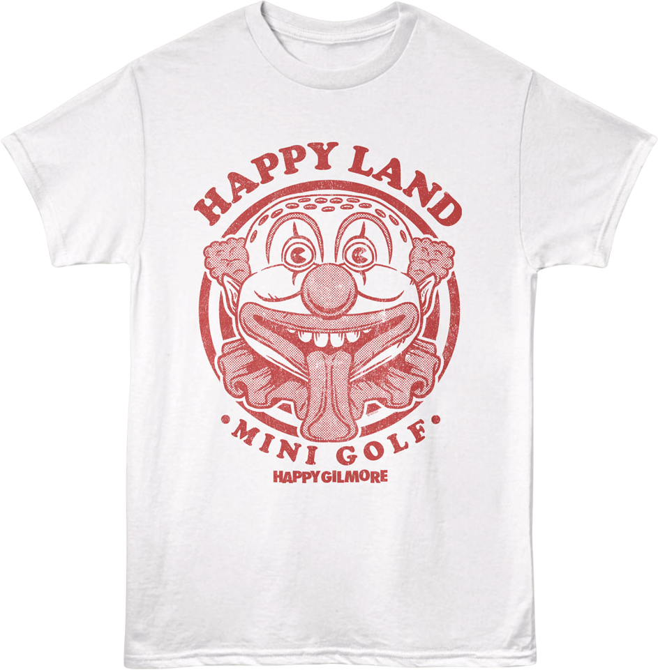 In Happy Gilmore, Happy Land is the mini-golf course where Chubbs Peterson takes Happy to practice playing golf. The golf course is filled with silly obstacles, including a mechanical laughing clown that keeps mocking Happy when he misses his putts. Everyone will know you are a fan of the 1996 comedy classic starring Adam Sandler when you wear this Happy Land Clown Happy Gilmore T-Shirt!