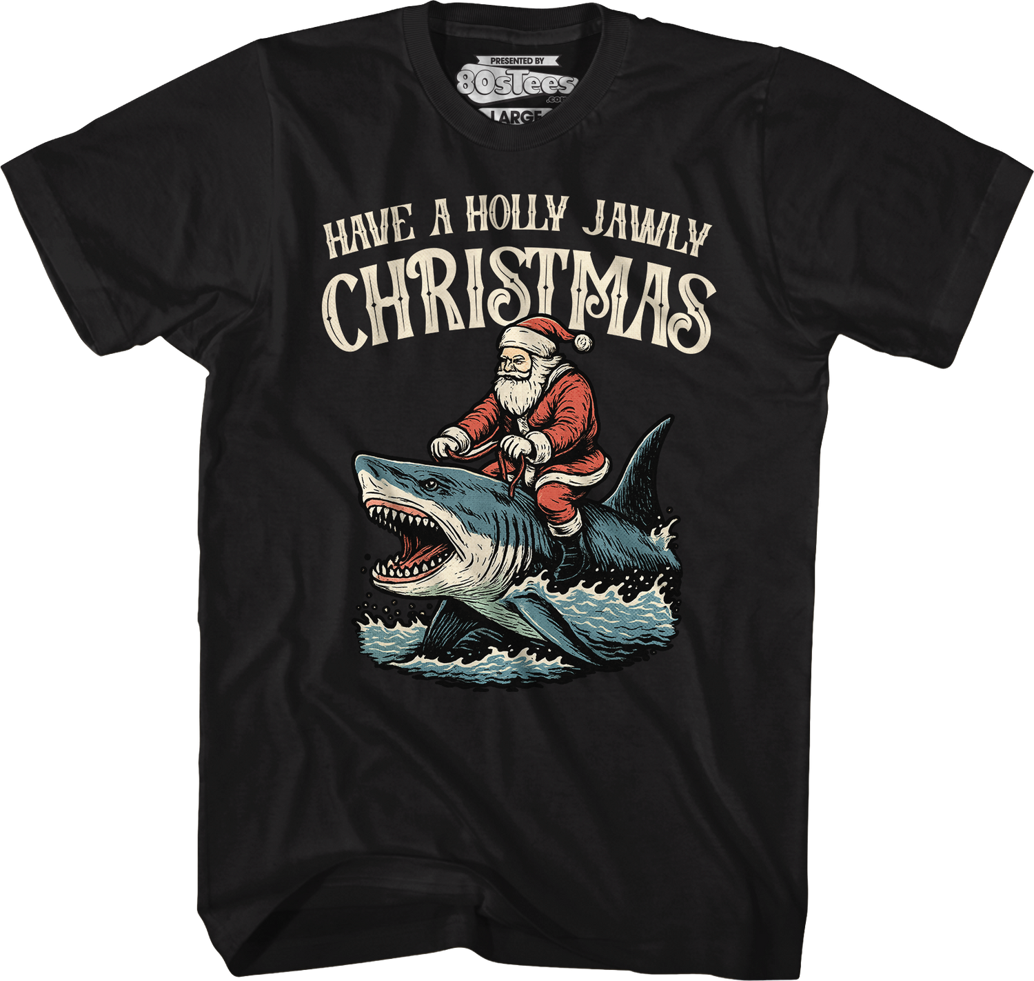 This holiday season, let everyone know you are a fan of Santa Claus and the apex predator of the ocean when you wear this 80sTees.com exclusive Have A Holly Jawly Christmas T-Shirt!