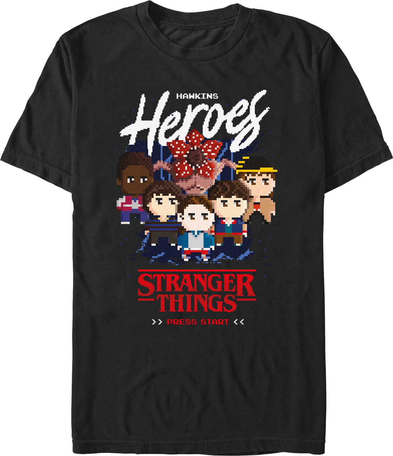 This Stranger Things t-shirt features 8-bit versions of Lucas Sinclair, Will Byers, Max Mayfield, Mike Wheeler, Dustin Henderson and the Demogorgon on the Start Screen for a Stranger Things video game named Hawkins Heroes.