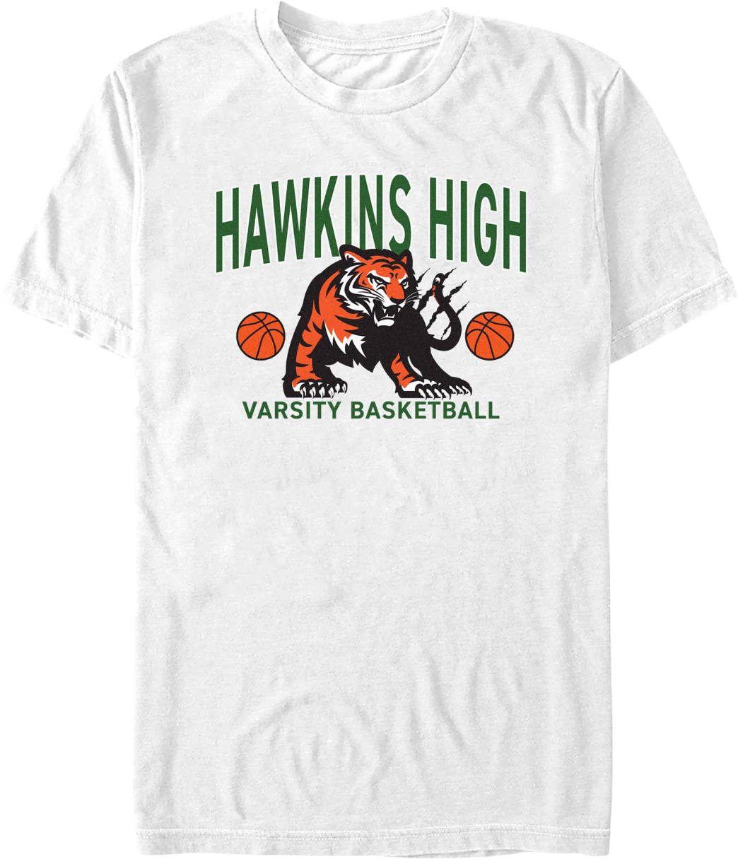 On Stranger Things, Mike Wheeler, Will Byers, Lucas Sinclair, Dustin Henderson, Max Mayfield, Robin Buckley, Jonathan Byers, and Eddie Munson went to Hawkins High School, where the Tigers are the varsity basketball team. While much of Stranger Things focuses on the supernatural, the Hawkins High School scenes are where the teen drama and character interactions really come alive. Everyone will know you are a fan of the classic series when you wear this Hawkins High Varsity Basketball Stranger Things T-Shirt!