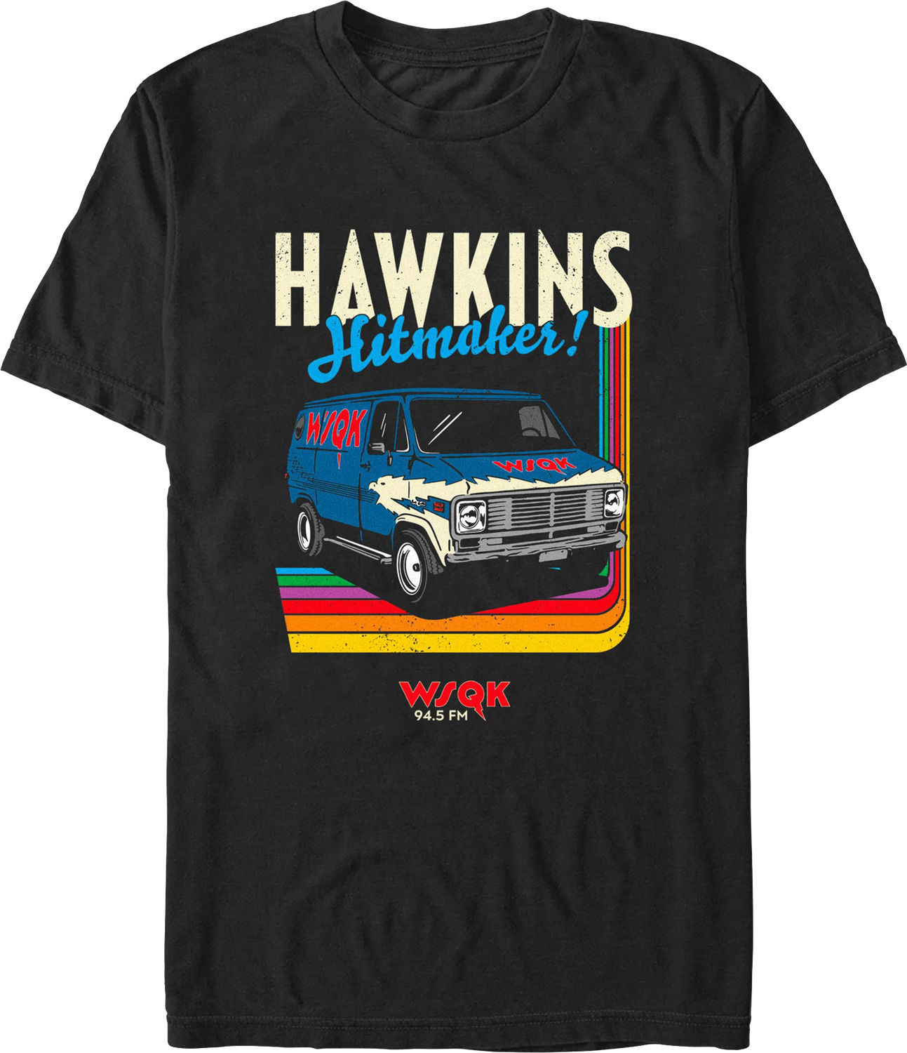 Stranger Things is one of the most popular sci-fi series of all time, and everyone will know you are a fan when you wear this Hawkins Hitmaker WSQK Van Stranger Things T-Shirt!