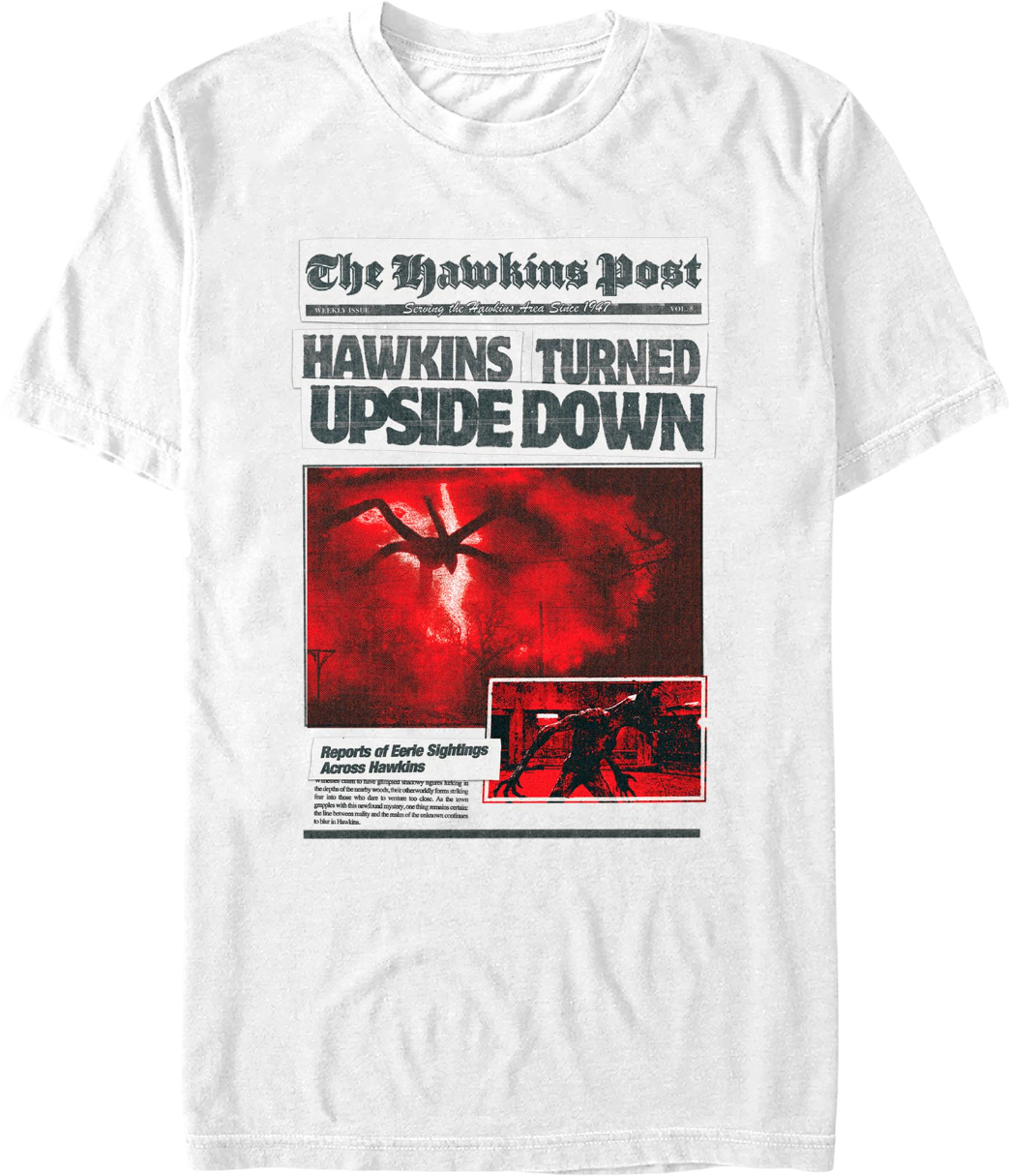This Stranger Things t-shirt shows the Mind Flayer and the Demogorgon on the front page of the Hawkins Post. The headline reads "Hawkins Turned Upside Down."